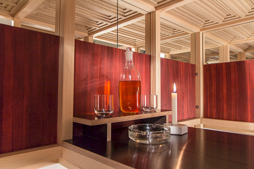 This shifted perspective expands the viewer's perception of the piece to an atmospheric bar with room for two people. Thereby, the Bar non-Lieu clearly focuses on interpersonal dialogue and its plain and minimal design offers the perfect setting for an intimate conversation. The interior deliberately refers to the famous American Bar in Vienna's first district.
